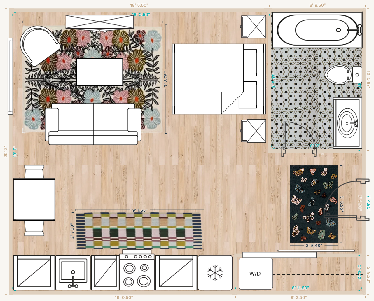 A detailed design plan for a single space with floor plan, rendering, sourcing, procurement and styling.